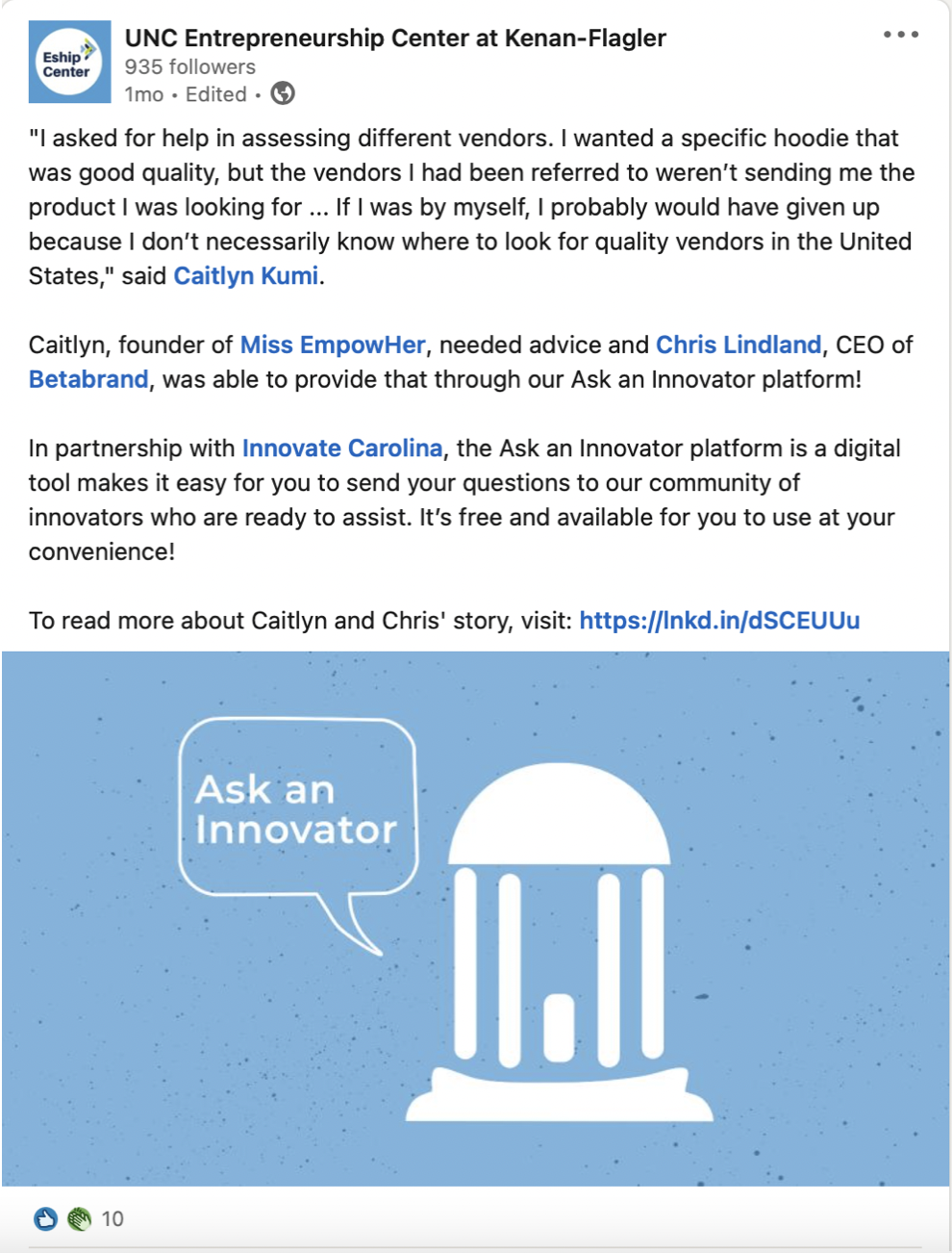 The Entrepreneurship Center at UNC helps entrepreneurs accelerate their journey along their unique path, as they define how they want to launch their careers or ventures. This often includes helping people to: discover their passions; develop a high emotional intelligence; build an entrepreneurial mindset and skillset; and connect with mentors and advisors to build lasting relationships. At the Eship Center, I was a social media marketing intern who managed their Twitter and LinkedIn profiles and helped increase awareness and event turnout during the 2020 pandemic year.